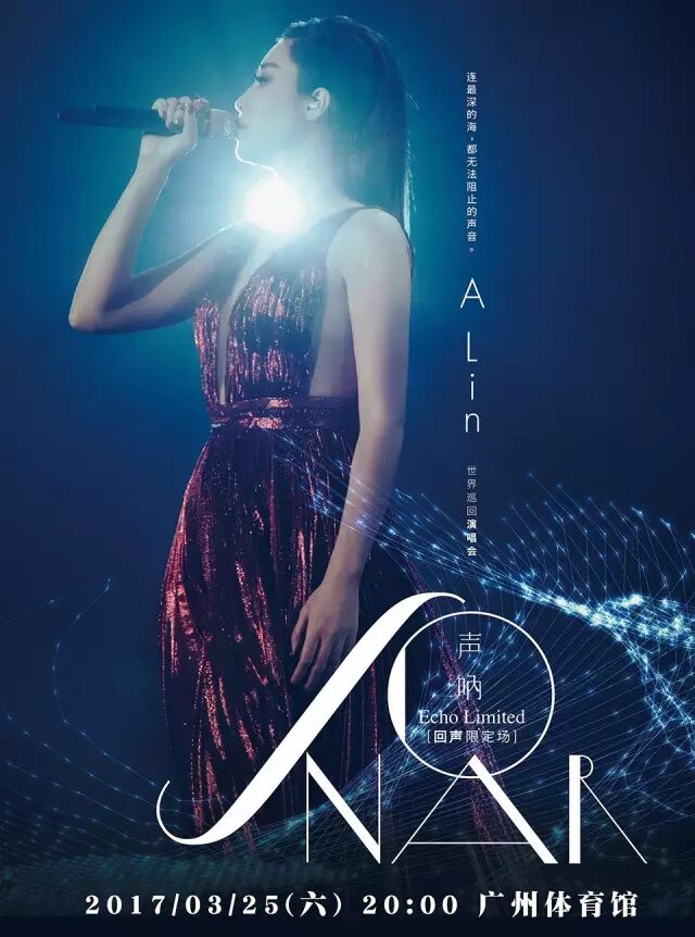 “声呐SONAR”世界巡演走过2015、2016来到了2017,这个春暖花开的三月,A-lin会在广州体育馆举行声呐巡演回声限定场。一路见证一场场精彩演出,太多美好回忆!太多天籁之音!太多人在她的歌里看到了自己的故事!未来的日子,A-lin会继续带着好音乐去更多地方,用歌声为大家注入满满正能量。