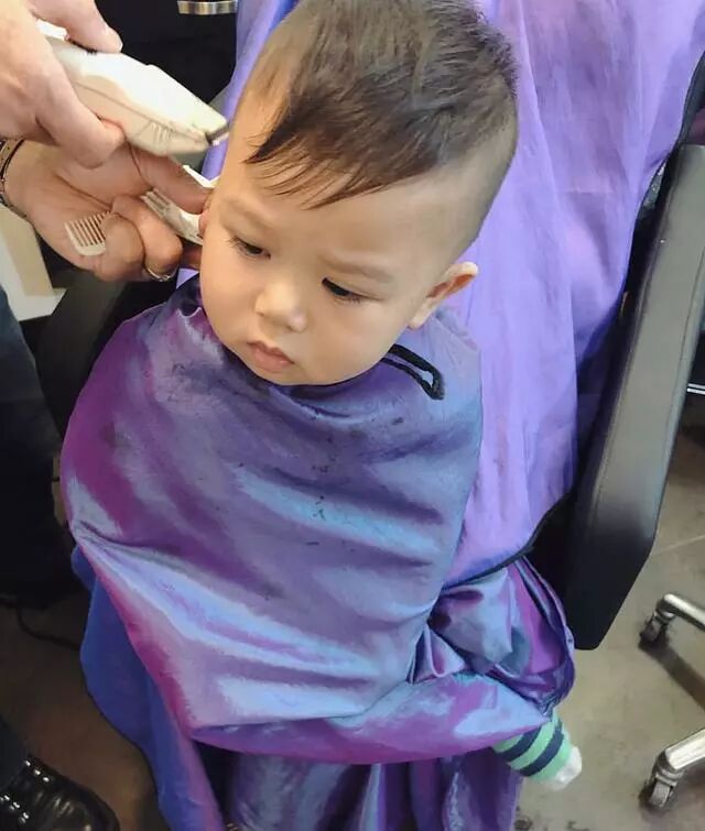 第一眼就被Brendan给萌哭了!小家伙穿着理发时专用的衣服,一动不动,而且这个拍照角度看起来有点儿迷啊,头特别大,身体特别小,不知道露出来的是不是小脚丫,也非常可爱!