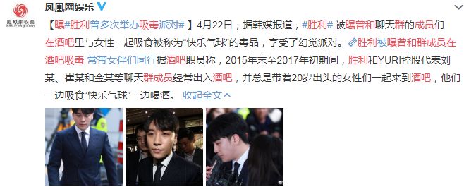 4月22日,韩媒报道胜利和聊天群成员经常带着20岁出头的女性一起到酒吧,而且吸食被称为“快乐气球”的毒品,享受幻觉派对。