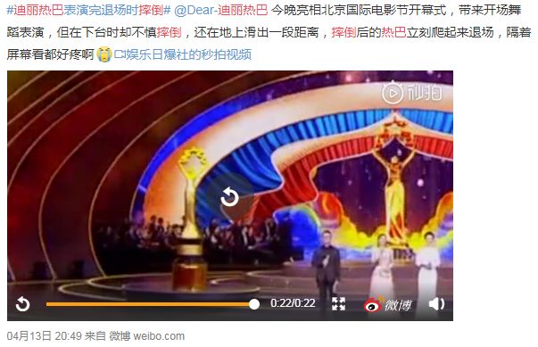 4月13日,迪丽热巴在北京电影节开幕式跳开场舞,结果下场不慎摔倒。