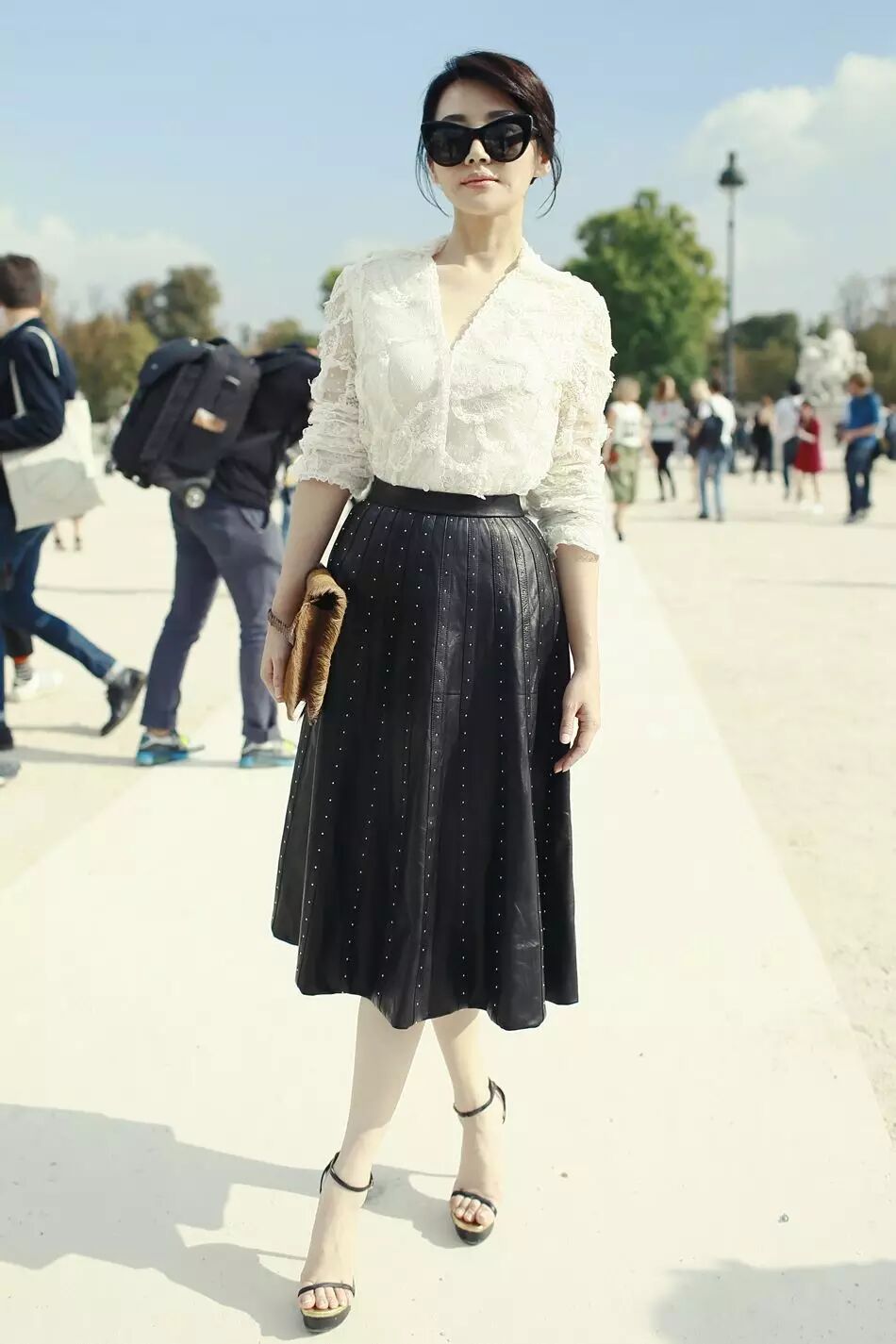 亮相2015春夏巴黎时装周,白色深V领蕾丝上衣若隐若现,透露出一丝朦胧美,搭配大黑超加黑色铆钉皮裙,性感中带着小俏皮,显得楚楚动人。