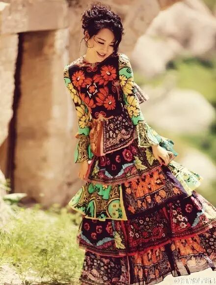 多层印花长裙,色彩搭配让人一眼看到美丽的深秋。