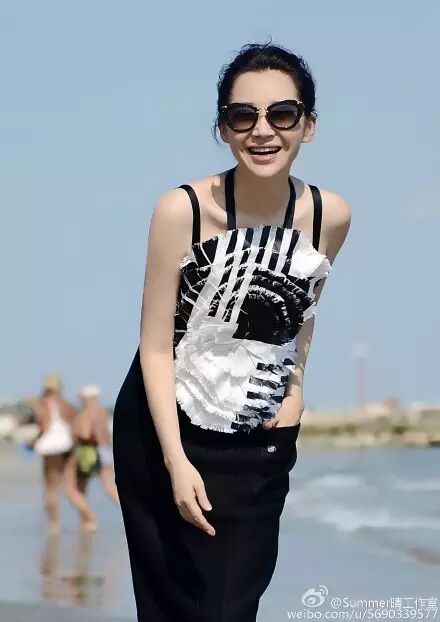 黑白撞色吊带衫,将白皙的肌肤与性感的锁骨展露无遗。