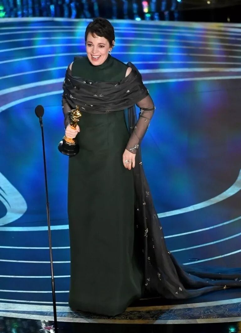 新晋影后Olivia Colman身穿Prada礼服,佩戴Chopard珠宝,上台领奖。