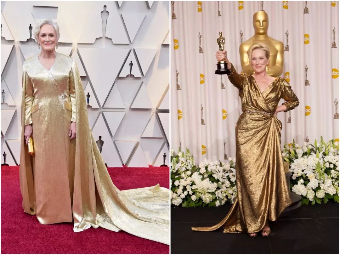 Glenn Close身穿Carolina Herrera by Wes Gordon金色礼服,佩戴Cartier珠宝亮相红毯,与当年梅姨一件Lanvin金色礼服异曲同工。