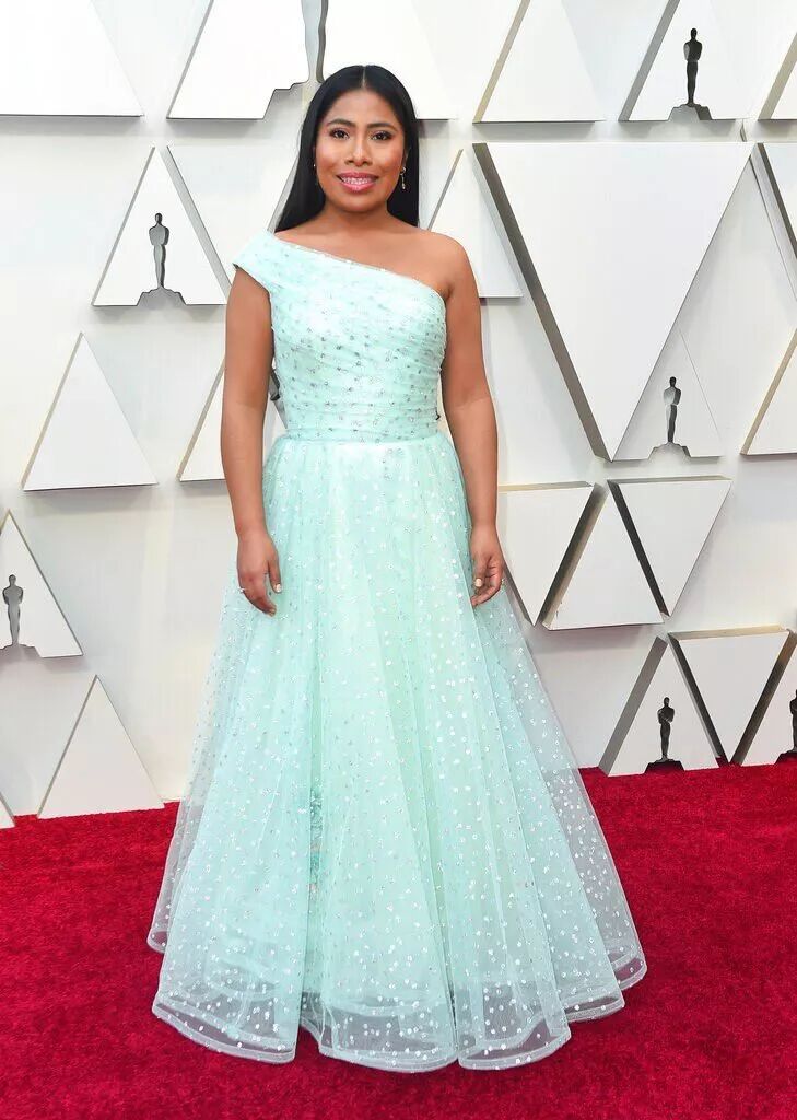 Yalitza Aparicio身着Rodarte斜肩薄纱礼服裙,同样选择了Forevermark珠宝,为整体造型加分。