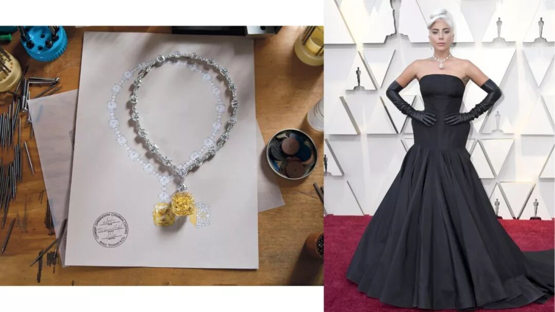 Lady Gaga身穿Alexander McQueen礼服,佩戴Tiffany & Co.珠宝,向Audrey Hepburn致敬。她佩戴的珠宝足足有128.54克拉,已有142年历史的它仅出现过三次,其中一次是当年Hepburn在《珠光宝气》的宣传照中戴过。