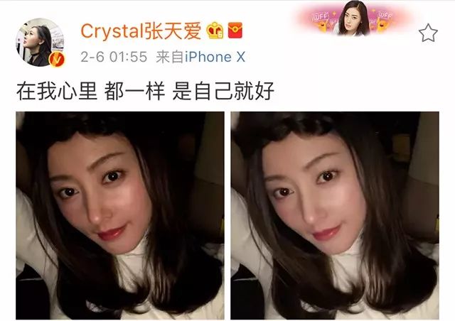 今天凌晨,张天爱在微博晒出两张自拍并配文:“在我心里,都一样,是自己就好。”两张自拍一张是原片,一张加了美颜滤镜。