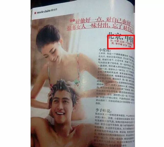2011年,她用“小爱”的名字和模特前男友李子峰一起接受杂志参访时,杂志上写的年龄是23岁。