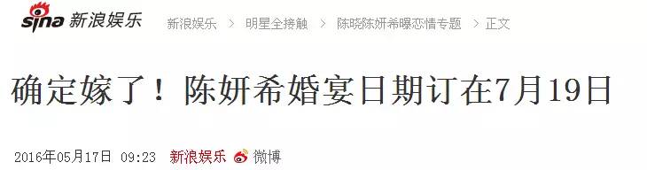 姐还记得上周520虐狗的惨烈情景~~在其他明星开启虐狗模式之前,姐就听到了陈晓和陈妍希婚期确定的消息了(姐真是老江湖啊)。▼