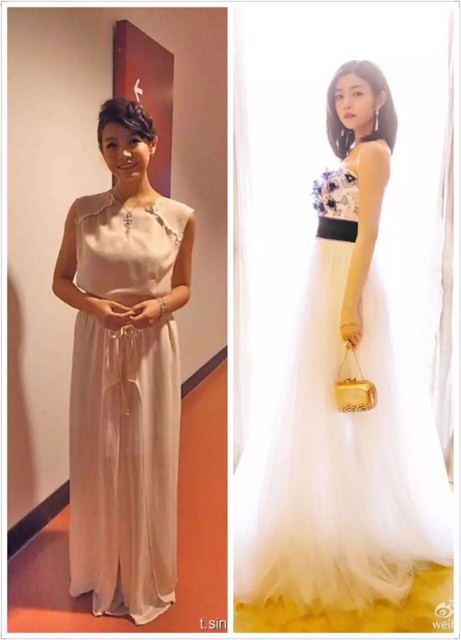 左边的礼服非常简单,而且看上去质量一般(终于知道为啥有人说陈妍希穿淘宝款了。。。),发型和脸型也不合适。