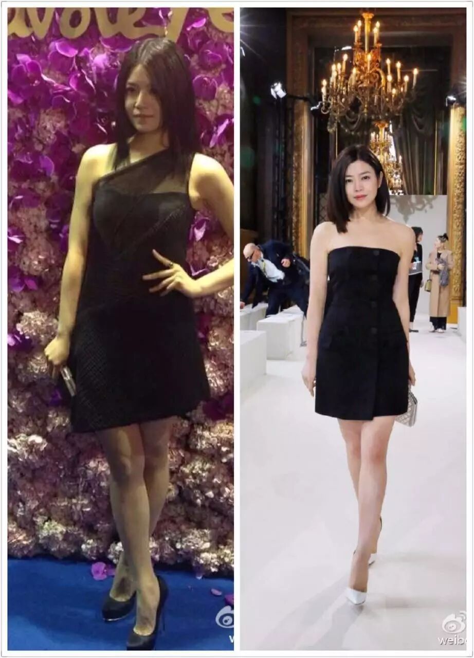 左边是拍摄《新神雕侠侣》期间的照片,黑色网面礼服裙搭配中分直发,显得过于成熟。