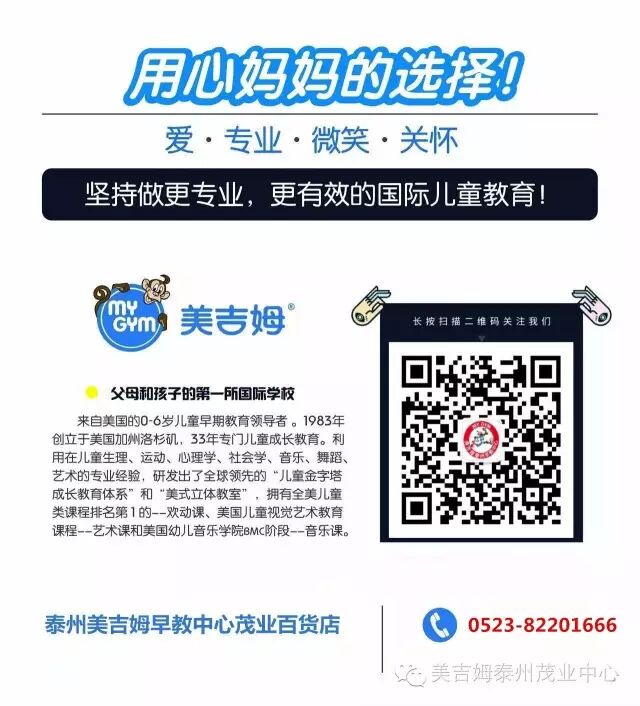 在体能锻炼的过程中孩子所体会到的喜悦和成就感,会帮助孩子建立良好的自尊和自信,并在之后的生活中影响到孩子发展的各个方面。在和训练有素的美吉姆老师互动的过程中,孩子们学习到如何与充满爱心的成人间建立温暖关系,从而更容易适应之后的幼儿园或学前班生活。在美吉姆,孩子更好的了解自己,学习到独立、自律、社交能力,甚至会幽默感, 并进一步增强自我认同感。对自己感觉良好的孩子会在通往成功的道路上一马当先。我们所有教具,地板地毯等设备均为美国进口,由全球所有中心统一配置;老师也都是专业培训和总部认证的!在美国排名第一的早教是毋庸置疑的哦!