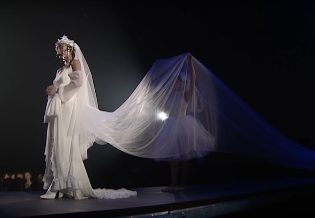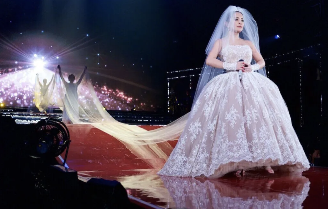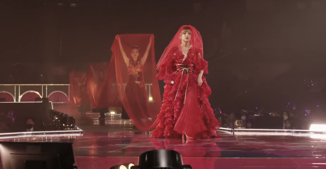 今年的跨年演唱会上滨崎步再次重现了令人印象深刻的 50 米超长摆尾婚纱造型。在 2003 年 A museum ~30th single collection live~上滨崎步曾经身着婚纱造型登场,在《M》歌声中缓缓走出,随后伴舞为她举起超长的纱质裙摆带来了震撼的视觉效果。另一次令人印象深刻的是在 2010 年的演唱会上,她再次以手捧婚纱的造型亮相演唱了《Virgin Road》,并在随后宣布了婚讯。今年她将白色的婚纱换成了鲜红,蓬蓬的裙摆变得错落有致,在经历了 25 年之后,平成歌姬再次向人们证明她依旧耀眼。