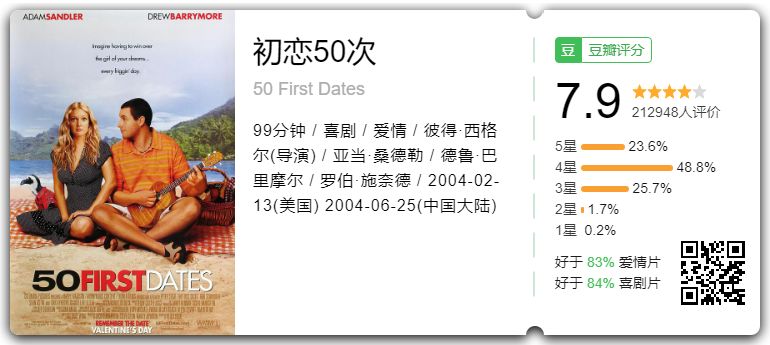 《初恋50次》这部电影总体是一部喜剧,虽然部分桥段有些老套和性暗示,但是整体上还不错了,宣扬了真善美,票房成绩也还不赖。现在重新思考,这部电影的意义不只是“一部温馨的爱情电影”。其中女主的病症是古德菲尔德综合征(Goldfield syndrome),此病症可以参考“顺行性遗忘症”。