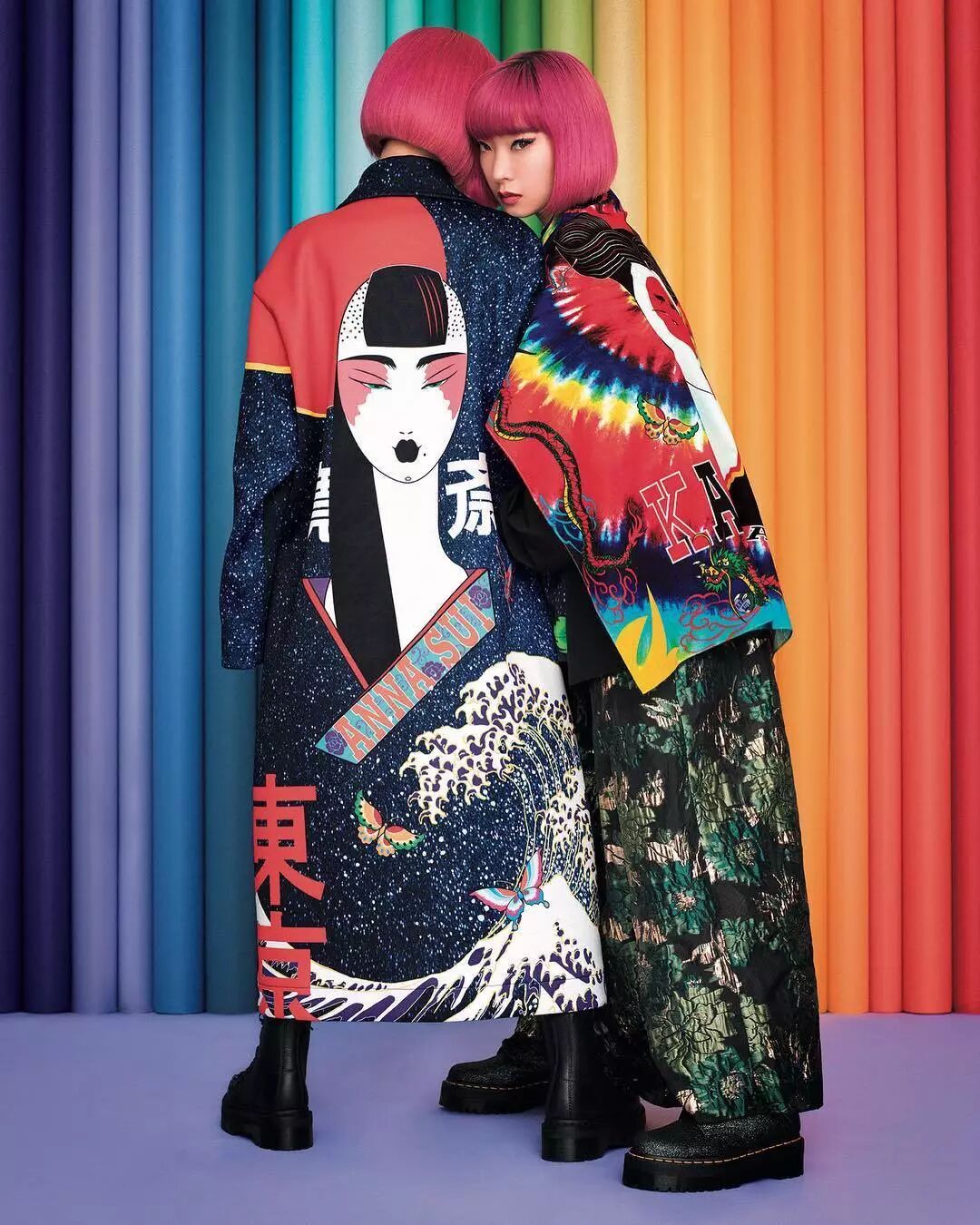 阔别时尚界数十年的山本宽斋(Kansai Yamamoto),听上去已经成为了一个过于遥远的名字。之所以说他或许即将回归时尚舞台,是因为在Anna Sui即将在五月一号推出的SWINGING TOKYO系列中,居然出现了和山本宽斋的合作单品。而他们的合作款也被最近大热的日本双胞胎姐妹 Amiaya 穿上了身,即将登陆日本杂志「装苑」的五月刊。