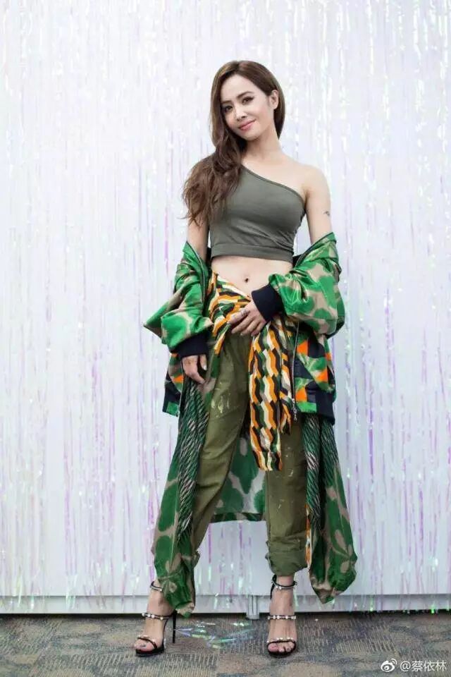 深绿色斜肩胸衣搭配军绿色卷边裤,宽大的绿色底印花棒球衣随意地挽在腰间,深深浅浅的不同绿色搭配出别致的风格,独特又大方,让蔡依林姣好的身材暴露无遗。