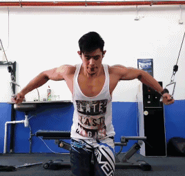 用身体两侧力量将哑铃推起,不要借助手臂或者肩部的力量,注意不要耸肩
