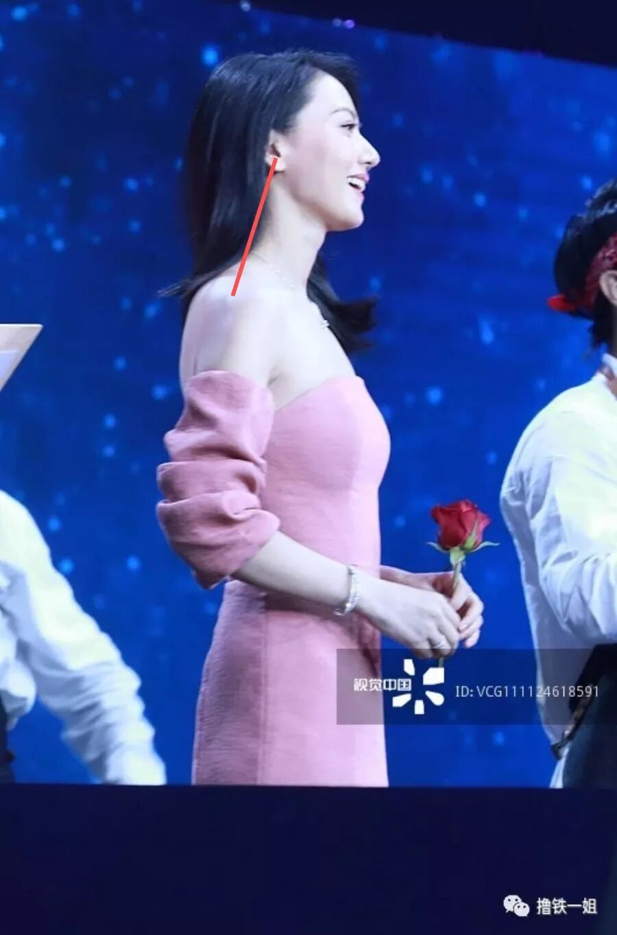 其实从侧面看,就能看出端倪。正常的体态,耳朵和肩膀应该是在一条垂直水平线上的,而高圆圆女神显得有些驼背。