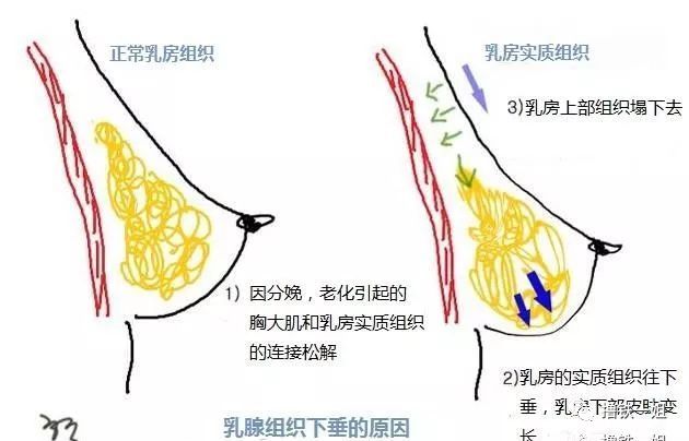 哺乳后导致乳房垂上加垂,是每个小仙女都避免不了,主要是哺乳停止后,因激素水平的减低,乳腺泡管,腺体及脂肪组织均发生萎缩,筋膜被拉长造成回缩不充分,而皮肤及支撑组织却相应较多,导致乳房下垂。