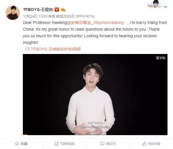 霍金教授当天很快就发了一条微博和视频回应了王俊凯,并表示“他的提问让我看到了中国千禧一代的年轻人对未来的思考和好奇心”。 ↓↓↓