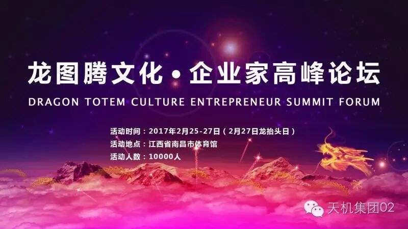 2017年2月25-27日江西南昌将举办中国有史以来最大型的企业家论坛——《龙图腾文化·企业家高峰论坛》。将邀请众多政府领导、专家学者、明星大腕、知名企业家、慈善家、演说家等40多位各领域大咖共同出席,倾情分享,共享智慧盛宴,有近100家新闻媒体全程直播。此次活动包含了6大主题:万众创业盛典探讨未来创业风口;龙图腾电影全球新闻发布会;新常态下的企业转型变革之道;传承五千年龙图腾精神,实现中华民族伟大复兴;文化产业淘金时代;龙图腾群星演唱会 。