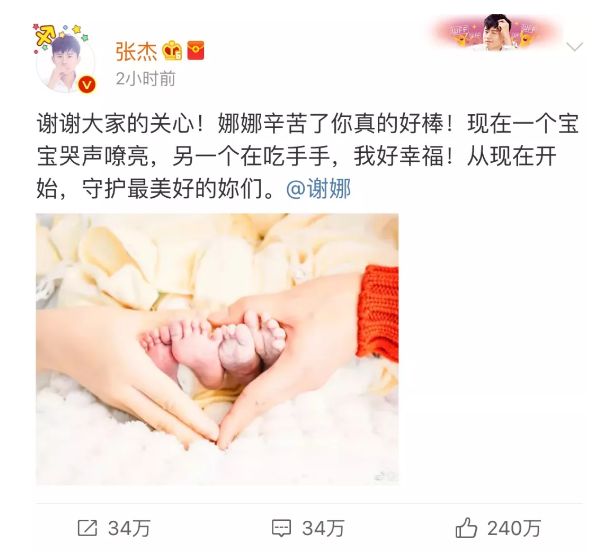 “一个宝宝哭声嘹亮,另一个在吃手手”。张杰完成了从男人到父亲的角色蜕变。