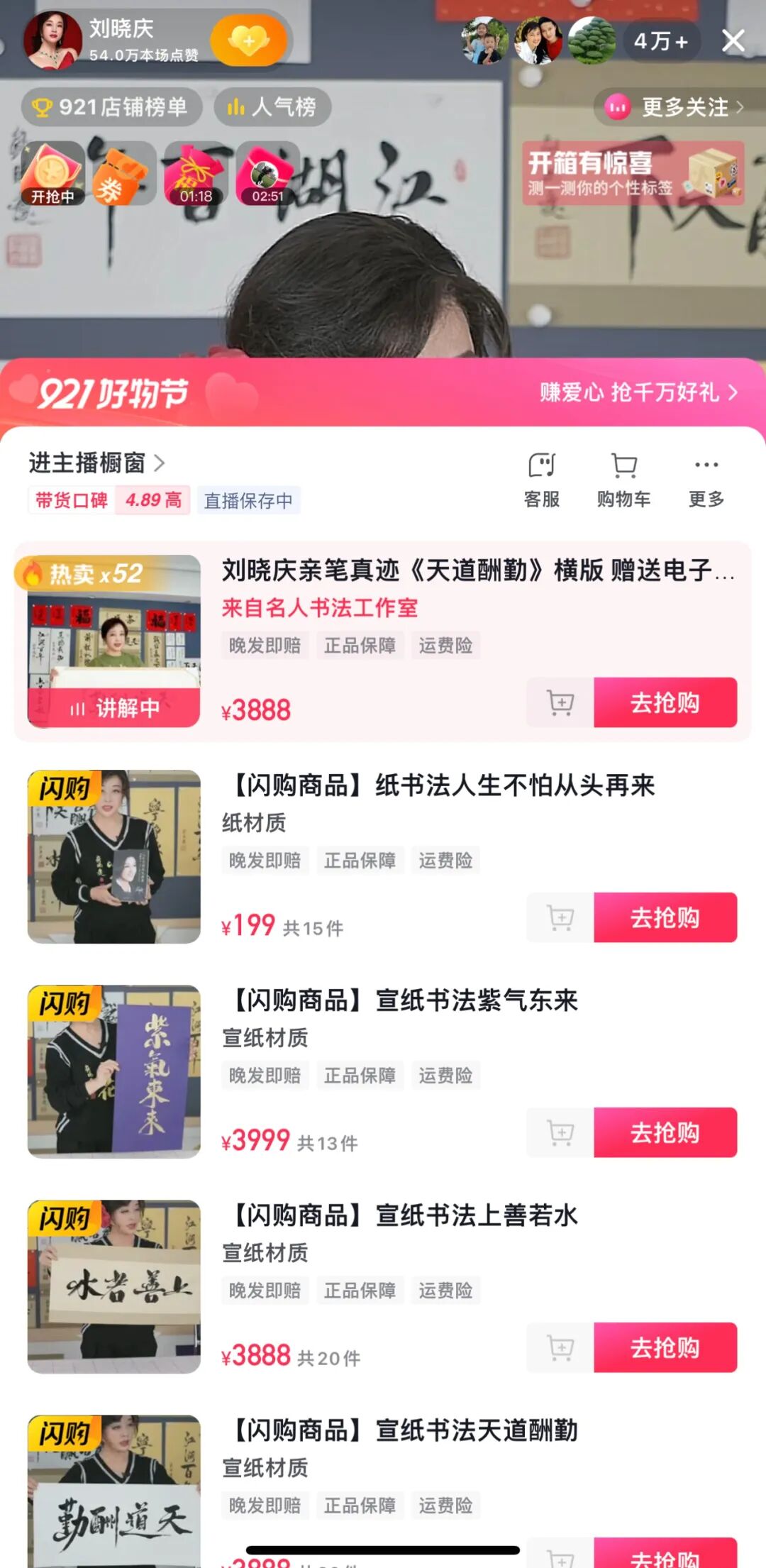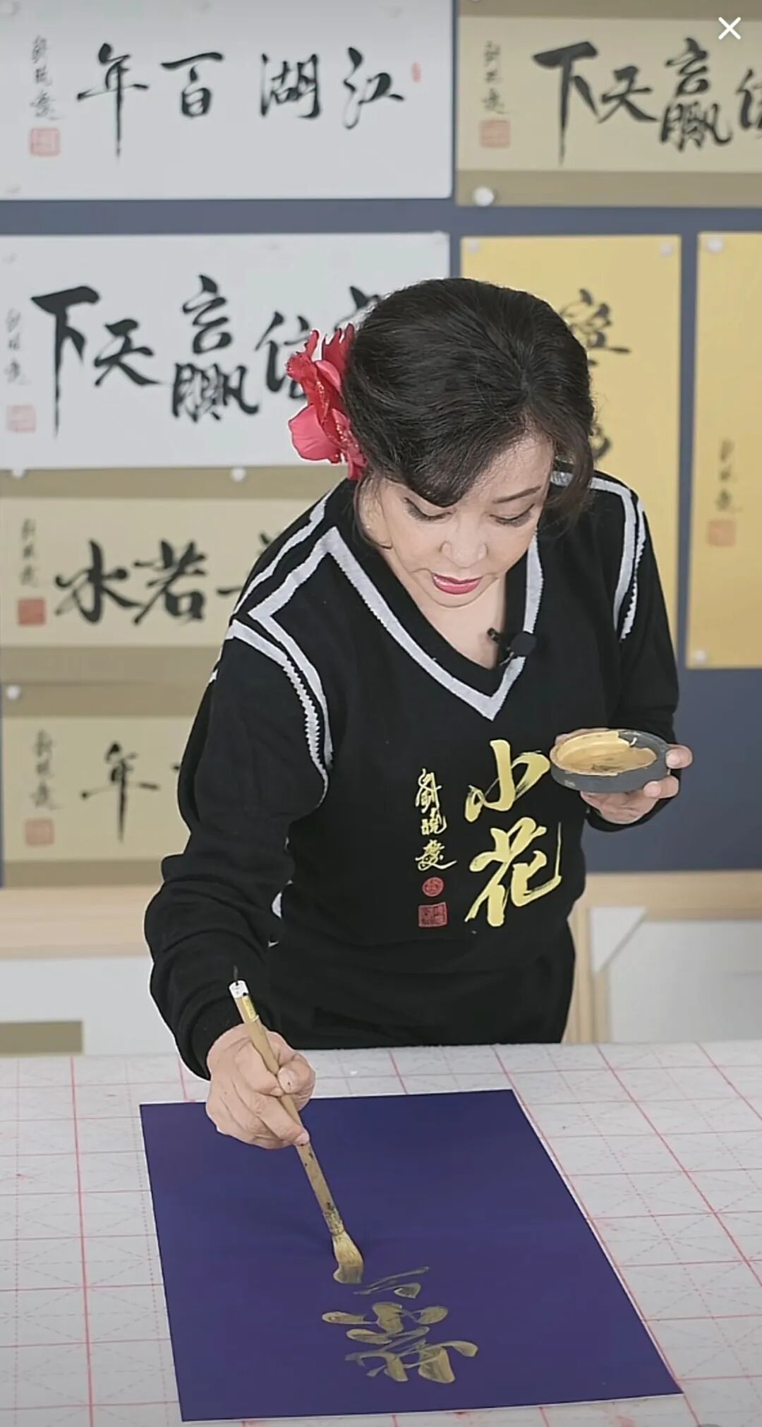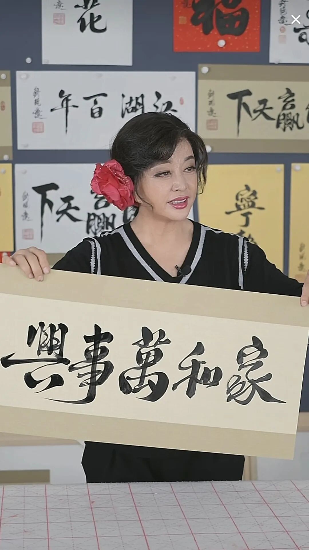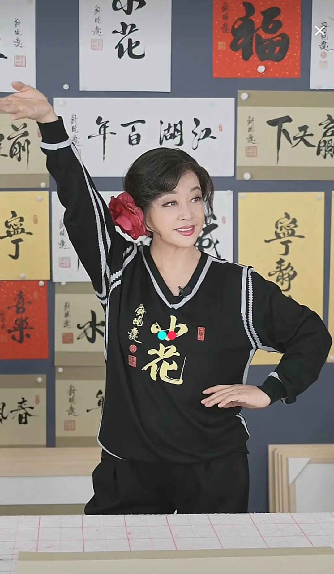 比如《风生水起》被她写成了“风声水起”,在直播间网友的提醒下,她才意识到错误,重新写了张正确的。