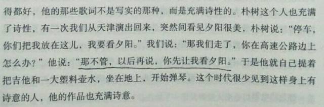 可是我们羡慕着朴树式的贫穷与富足——富有的活着,即使没有那么多钱。这份羡慕与喜欢,是我们的堡垒啊。每当我们觉得被世界打磨的即将失去最后一点点尖利时,回过头看:原来我依旧羡慕着那个把自己活成了“我的诗和远方”的人,原来我还是有点追求和坚持的嘛。