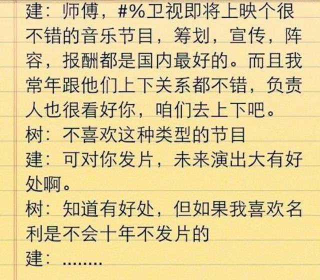 他不接商演,不上综艺,对于合作对象都吹毛求疵,甚至不更新微博。他的挂名经纪人叫他师傅,发过他俩的对话。