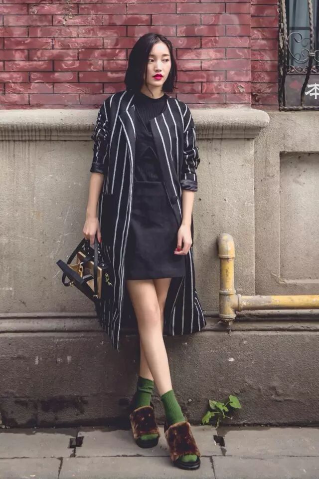 从上到下穿黑,如果不做材质上的变化,很容易给人落后于时代的印象。注意在面料的使用上制造视觉的层次感。通过面料的薄与厚、软与硬、有光泽和无光泽、精致和粗糙等反差要素形成对比,基本上就能避开黑色沉闷保守的一面,示范搭配: