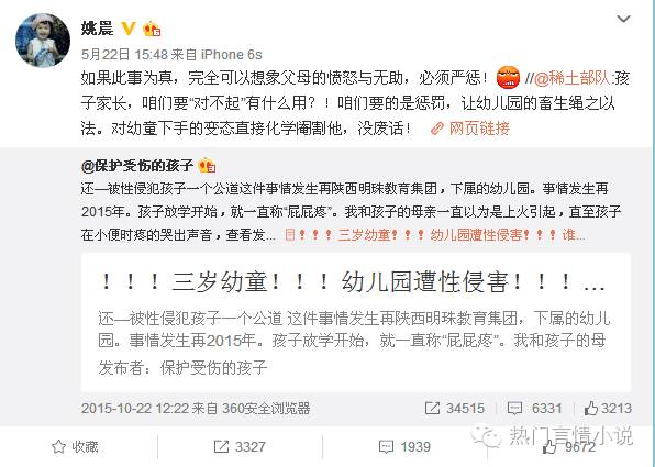 刚当了妈妈的章子怡,转发微博并评论:“孩子家长,咱们要“对不起”有什么用?!咱们要的是惩罚,让幼儿园的畜生绳之以法。对幼童下手的变态直接化学阉割他,没废话!”姚晨也转发微博,表示对该案件的愤慨。
