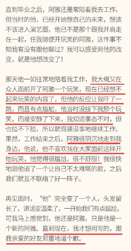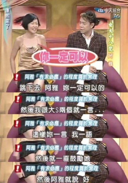 两人不联络了一段时间,后来小S在节目上、书上都正式向阿雅道了歉。话虽如此,小S道歉书上还是坚持用“他”——从华冈艺校开始,她们就调侃阿雅长得像个男人,阿雅曾经在意过,但现在也已经可以自我调侃。