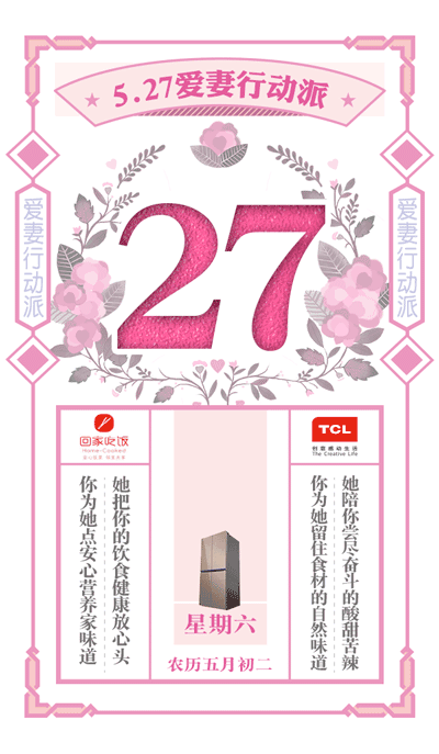 520刚刚过去,在亲眼目睹了未婚青年们的狂欢后,现在,专为已婚青年定制的527(我爱妻)终于来了。要想保住爱情的鲜味,别着急准备花里胡哨的表白,做一个像黄磊一样的“爱妻行动派”,赶紧和TCL一体变频风冷冰箱约起来吧,上京东升级真好生活,真好生活就选TCL。