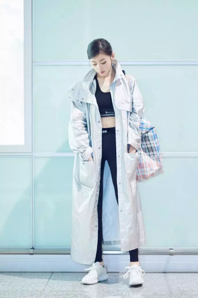 如果只是这样穿搭的话那只能说张天爱的身材无敌,出入健身房完全没问题。但是张天爱给自己搭配了一件长款银色雨衣状风衣,长到脚踝处,真个人看起来干净清爽不说,一下子有了时装周上超模的视觉look,一下子有了立体感和时尚感,超模范都起来了。