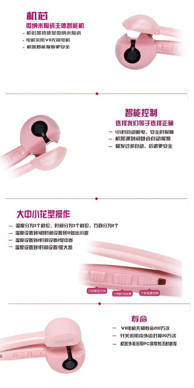 5分钟打造完美卷发造型,颠覆性的设计,全自动的卷发体验,配合反馈式PTC加热模块,单手打造女神!你是不是迫不及待的想要深入了解以下呢?不急不急,小编带你一步步来认识。