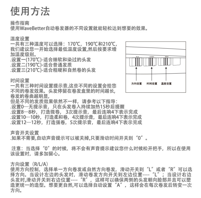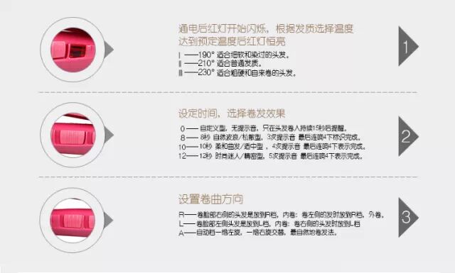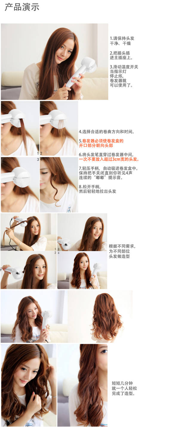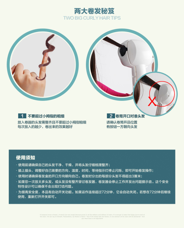 为了让各位亲能更好的使用的自动卷发棒,我们附上产品的操作指南,使用之前请务必仔细了解哦!