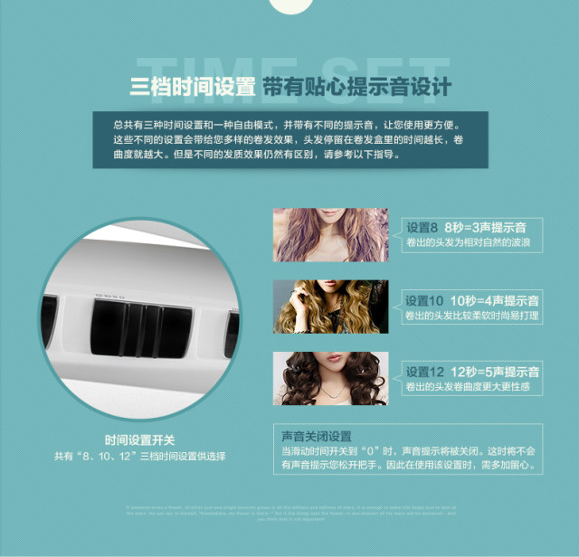 头发停留在卷发棒里的时间越长,卷曲度越大,所以我们设置了3档提示音来提示你的卷发效果。当然如果你已经很熟练了,可以将滑动时间开关到“0”,提示音将被关闭。