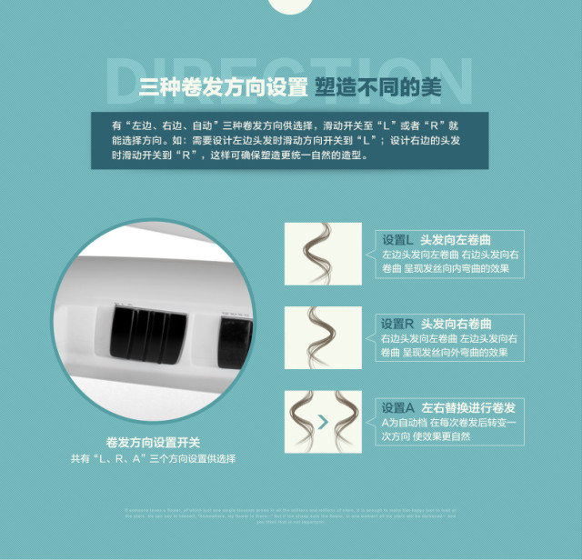 这款卷发棒的神奇之处就在于直发进,卷发出,颠覆了以往手动卷发的设计概念,相当方便!