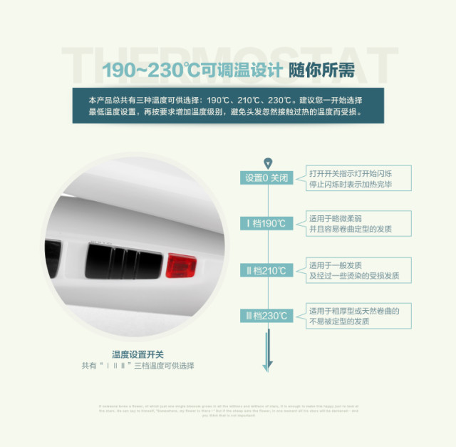 建议一开始选择最低温度,再按要求增加温度级别,避免头发忽然接触过热温度而受损。