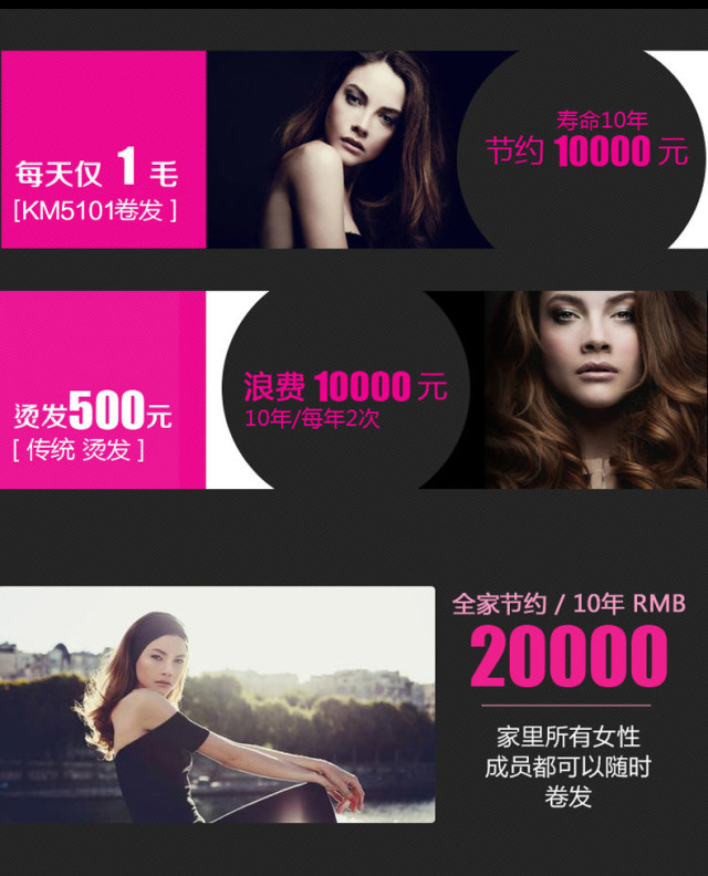 下面小编来给大家算一笔账,你去理发店一次要500,半年烫一次,10年就是500*20=10000,重点是损发质,你平时再做点护理保养15000总要吧!如果用自动卷发棒呢?1天1毛钱,秀发0损伤,不需要额外的护理,而且1年给你365个造型,就算天天用,10年也只有365元!太划算了有木有!