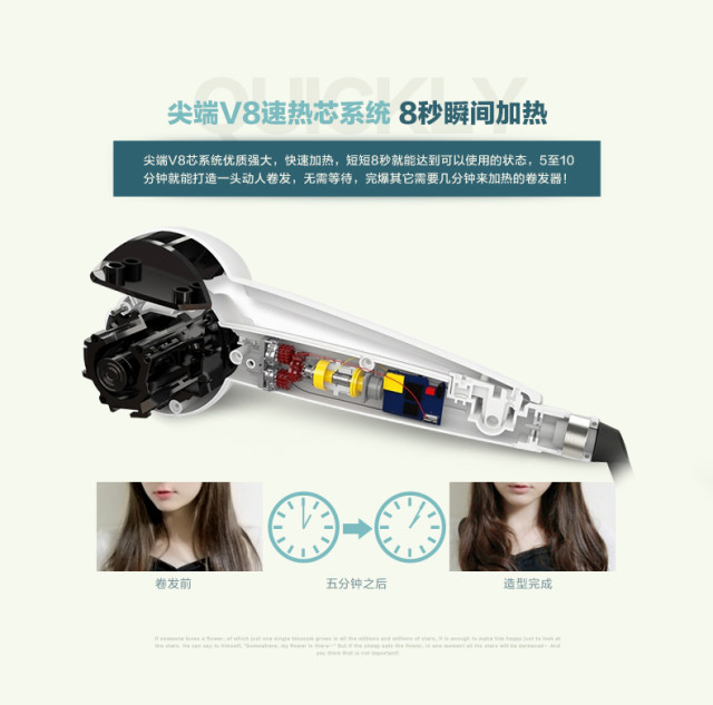 尖端V8芯系统优质强大,快速加热,8秒就能使用,5-10分钟为你打造动人卷发,无需等待!