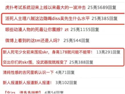 回到此次的虎扑与吴亦凡之争,实际上就是两个粉丝社群之间引发的冲突与矛盾:一边是关注大众偶像、主要聚集在微博的“迷妹”,一边则是聚集于体育论坛的“直男”。在号称“华语直男论坛”的虎扑,主要用户是年轻男性,他们称自己为JRs(贱人们或者家人们)。虽然论坛内部也会因为梅西C罗、詹姆斯科比产生纷争,但这些球星往往具有一定的实力作为支撑,对吴亦凡的不满在于对其真实水平的质疑。