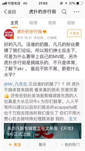 简要回顾一下事情的源起:一位网友在虎扑步行街论坛发出的视频,题为“吴亦凡无修音视频,你能坚持到第几秒?”,在虎扑引起群嘲。一位吴亦凡粉丝在微博平台公开发出的“反黑”号召(粉圈专用词语,指通过举报等手段反击恶意抹黑偶像的人),呼吁粉丝们杀进虎扑,反击“黑子”。随后,虎扑步行街官方账号连发40多条微博回击。吴亦凡本人的出面及其工作室发出的法律声明,更是将这一场本是集中于虎扑论坛内部的讨论推进为两个圈子之间的网络“赤壁之战”。