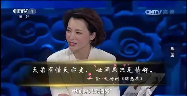 当《中国诗词大会》节目现场,台下专家为“天若有情天亦老”的下一句争论时,董卿随口说出一句 “月如无恨月长圆”,随后又道出“天若有情天亦老,世间原只无情好”。