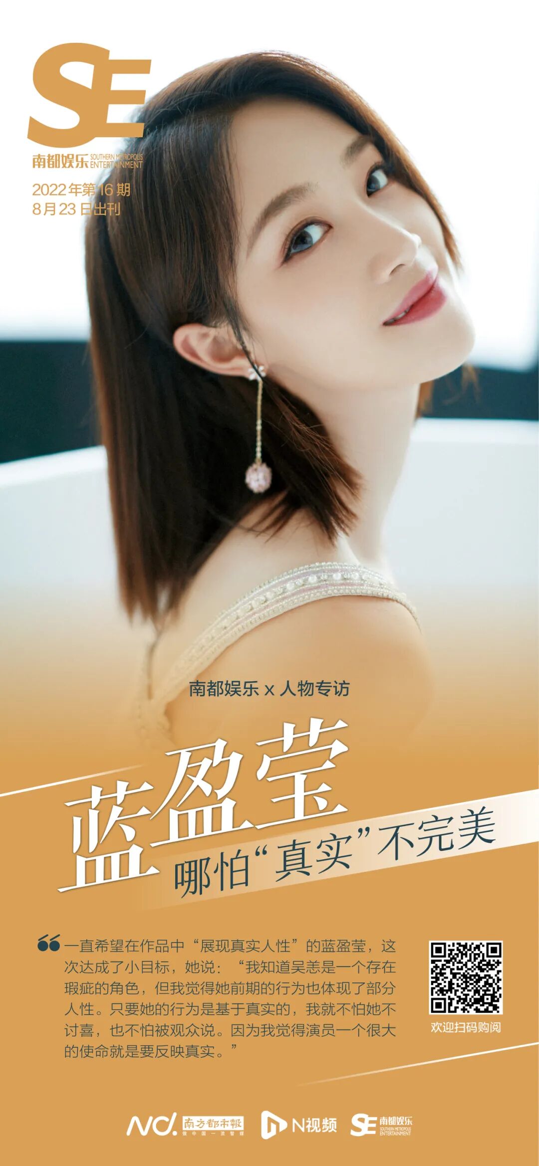 蓝盈莹:我会害羞,也不会去特意看自己的综艺或作品,这个可能跟我很少后悔有关系。但我会回望,有一些让我感受非常深的场次会看,想看剪辑出来的效果是不是跟我想象中的一样,未来我应该如何调整自己在表演上的分寸感,总结完经验了以后就会let it go。但这样其实也不好啦,辛辛苦苦拍了那么久的戏,自己不好好地全部看完,其实不好。我觉得未来还是要找一个机会把我以前所有的戏都要看一眼,但是总觉得时间不够用。