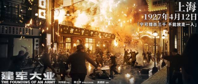 在近四个月的拍摄时间里,全组600多人辗转北京、上海、南昌等多个城市,横跨数千公里取景。为了将影片打造成本年度真正航母级的华语战争巨制,导演刘伟强及监制黄建新以真实还原历史质感为准则,大到能容纳1500人的错综复杂的战场,小到印书馆内每一本书的摆放,处处都体现着主创们的用心。另外,南昌起义、三河坝战役等战争戏相关的场景亦占到近一半,让擅长制造爆破等热血场面的刘伟强“炸出新花样”,创造出单镜头200炸点同时引爆的视觉奇观。
