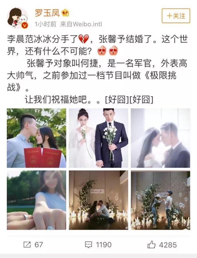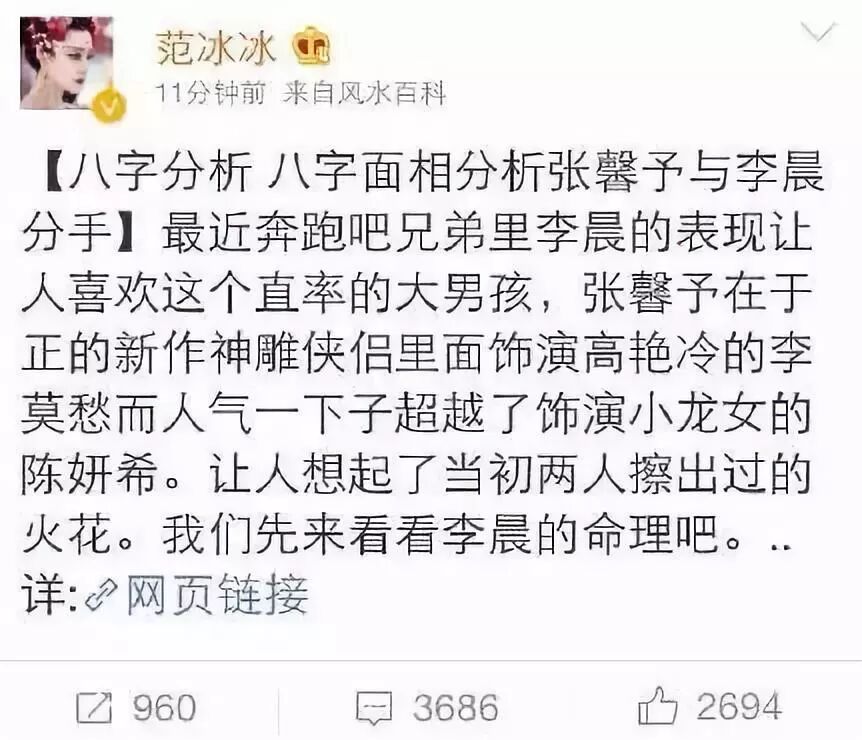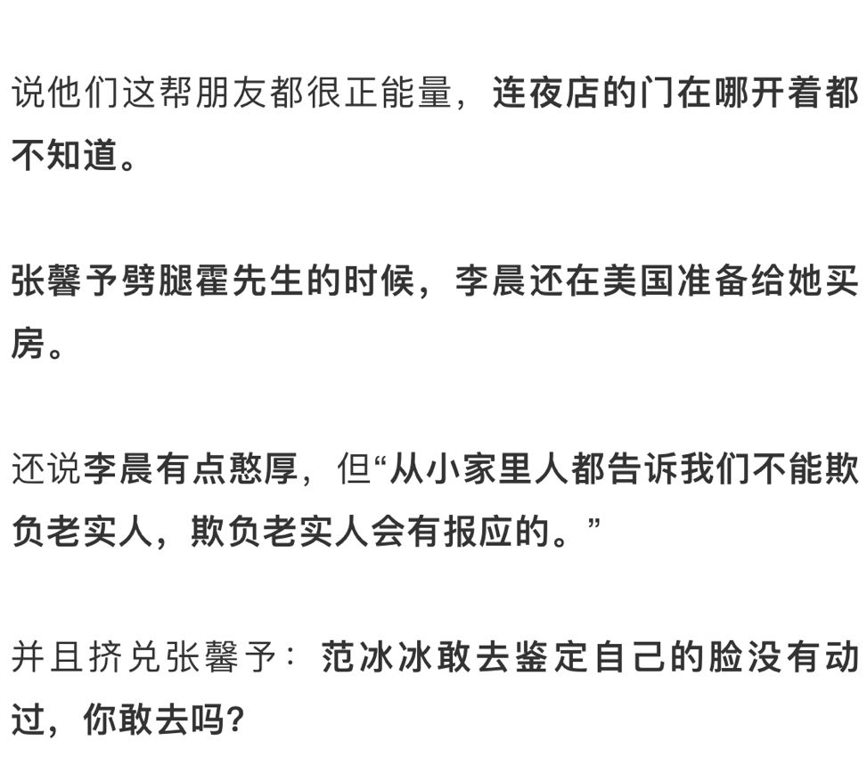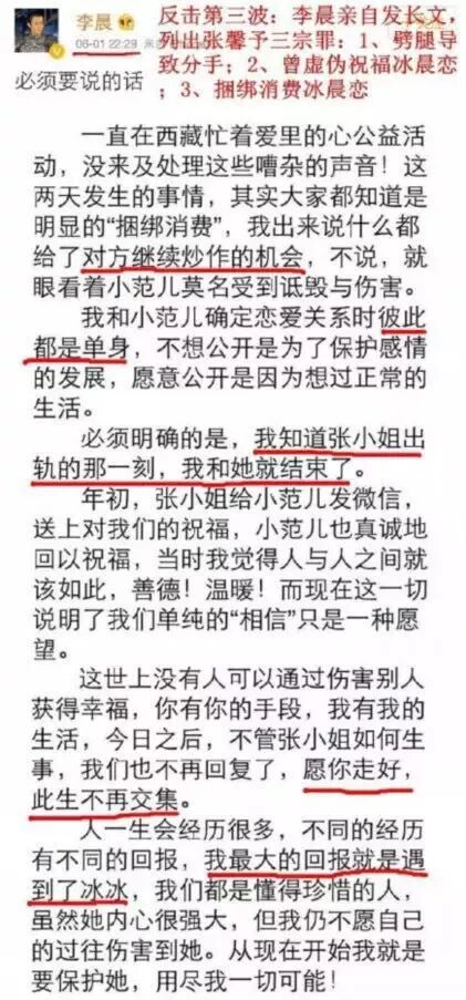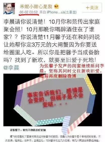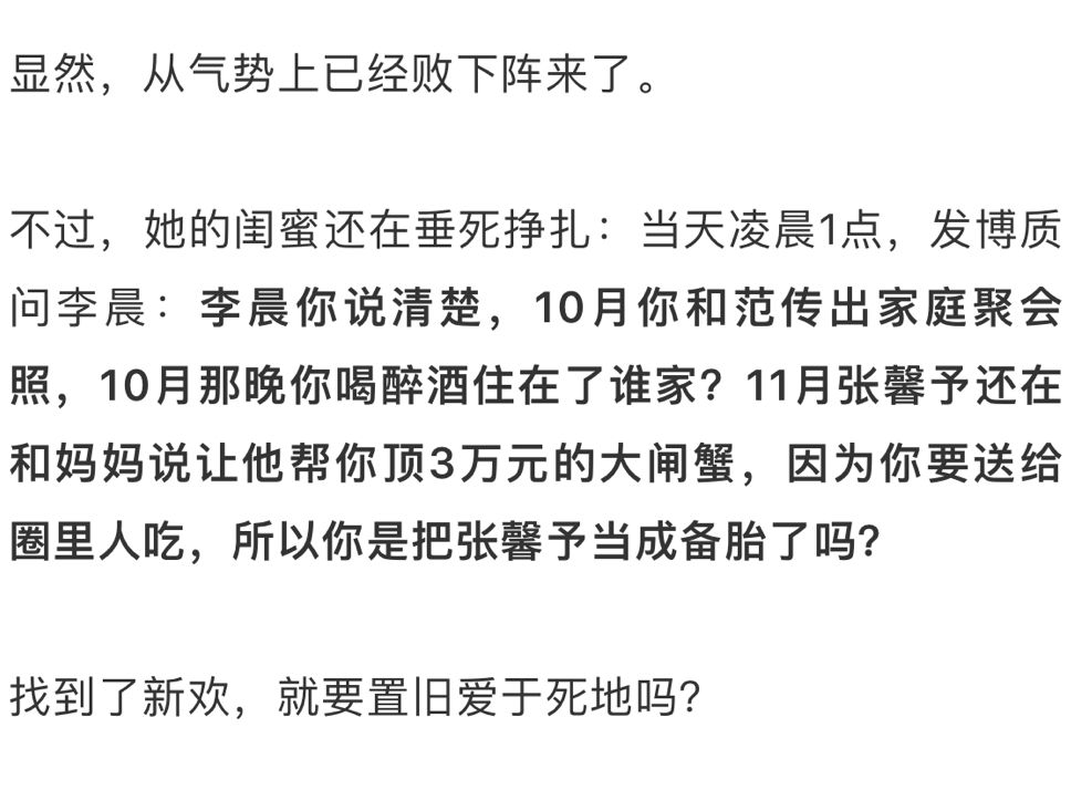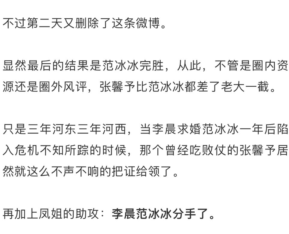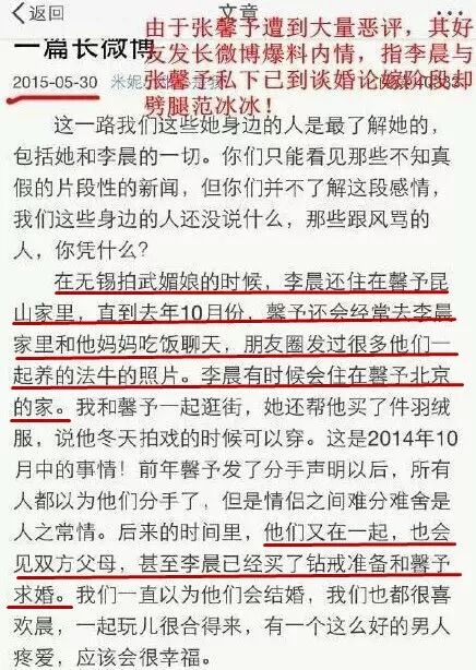 而最后起到绝杀作用的是李晨的一篇微博,盖章张馨予先劈腿,并且借机捆绑自己和范冰冰炒作。
