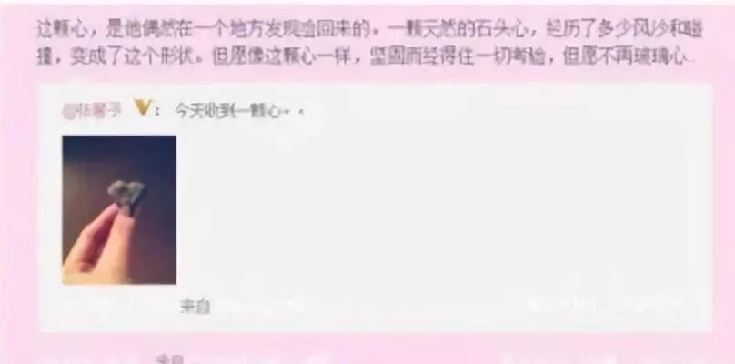 刚公布恋情的张馨予每天都是甜蜜的,9月7号的时候,在微博晒了一颗心形石头并写道:“这颗心是他偶然在一个地方发现拾回来的,一颗天然的石头心,经历了多少风沙和碰撞,变成了这个形状,但愿像这颗心一样,坚固而经得住一切考验,但愿不再玻璃心”。