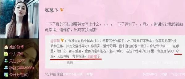 2012年8月23号,李晨在微博向张馨予起誓:今后,天涯海角,有我相伴。